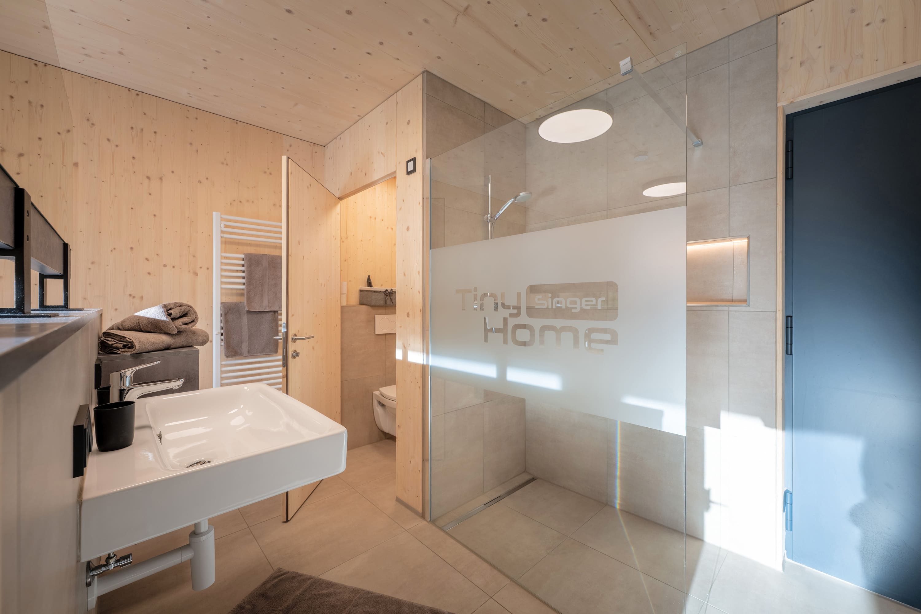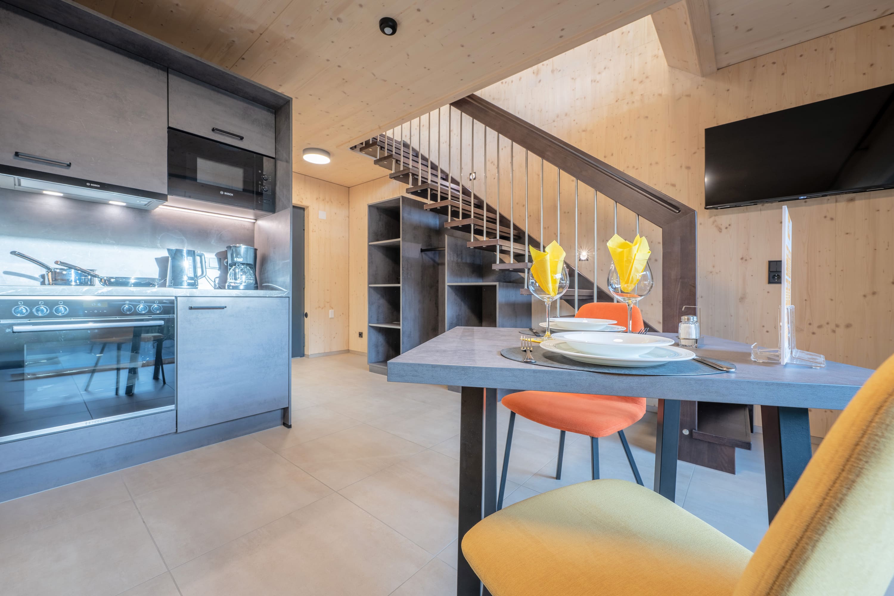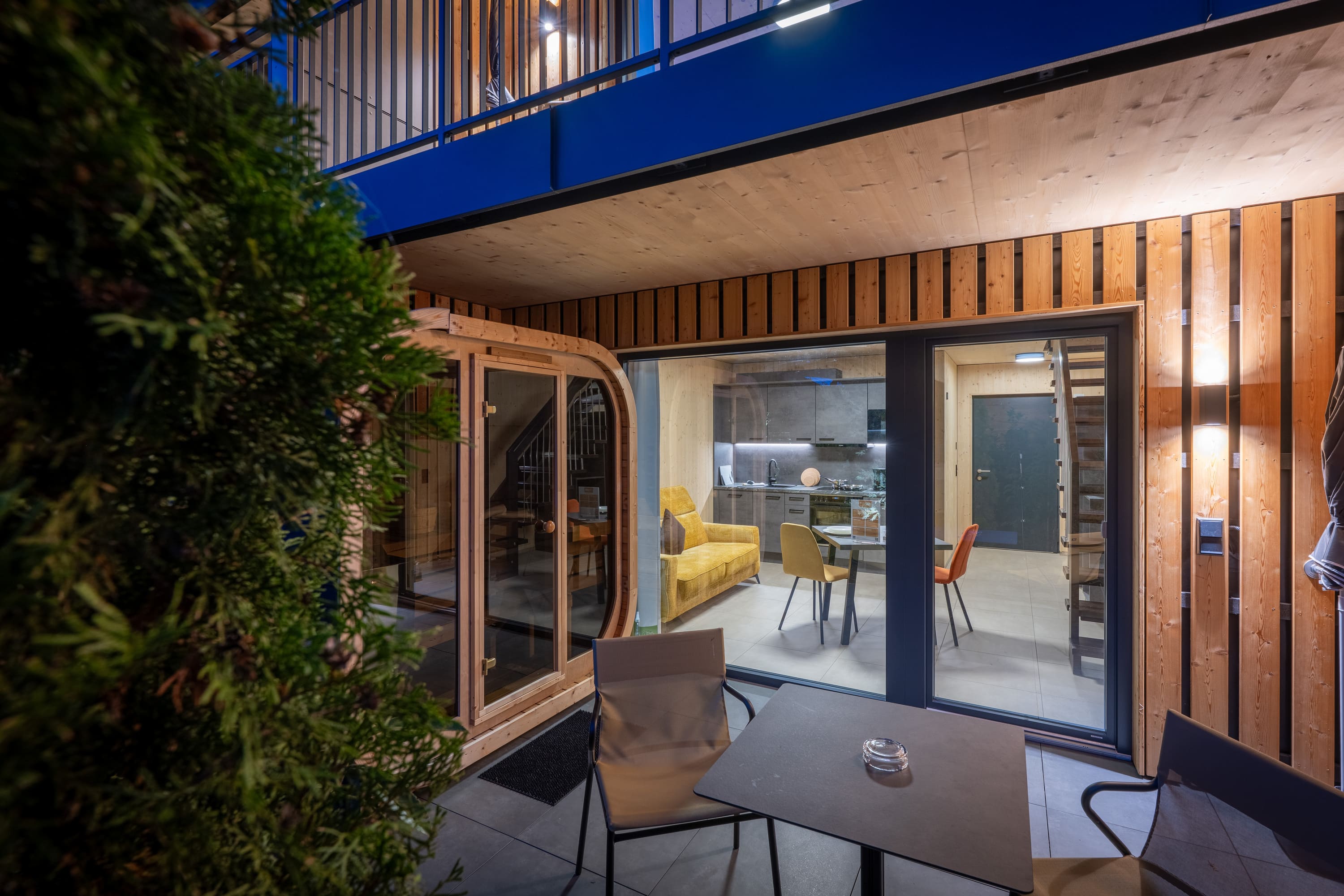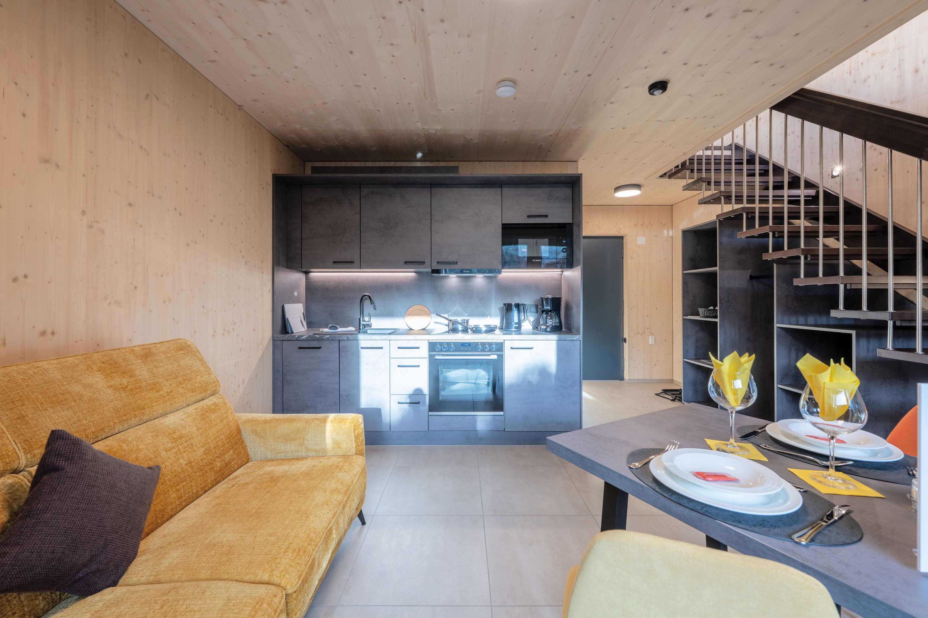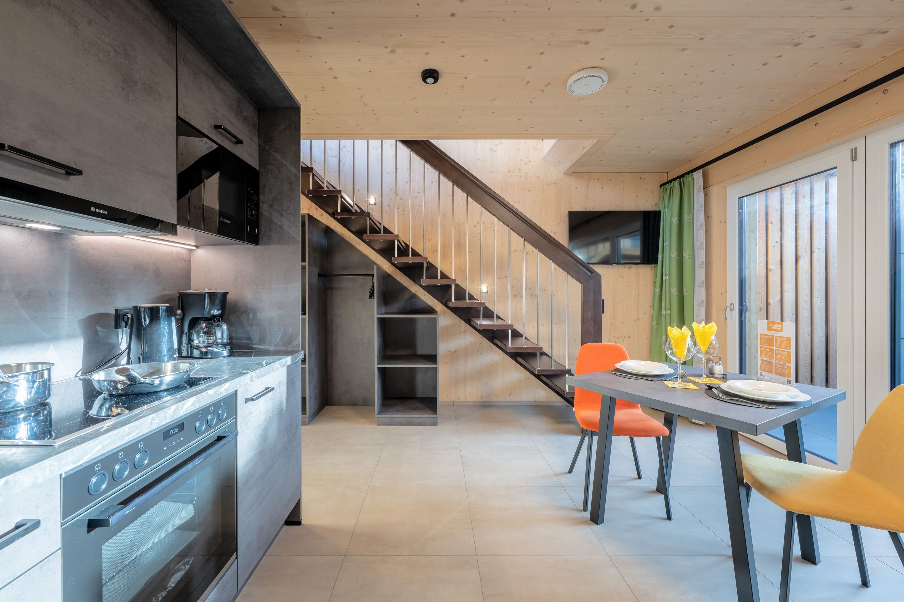 Unser Premium TinyHome ist ca. 60 m2 groß, inkl. privater Sauna und bietet Platz für 1 bis 2 Personen. Eine handgefertigte Innentreppe aus Buche-Massivholz, verbindet das Erd- mit dem Obergeschoss. Der großzügige Balkon und die Terrasse ermöglichen Ihnen einen einzigbartigen Ausblick auf die Berge.